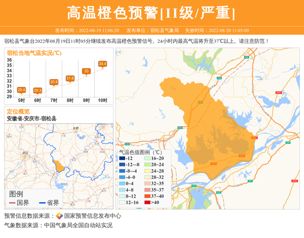宿松县气象台2022年08月19日11时05分继续发布高温橙色预警信号。24小时内最高气温将升至37℃以上。请注意防范! 信息来源:国家预警信息发布中心; 发布单位:宿松县气象局。