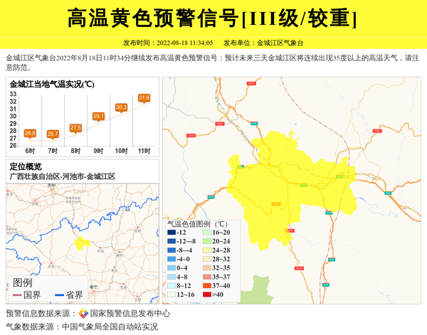 金城江区气象台2022年8月18日11时34分继续发布高温黄色预警信号:预计未来三天金城江区将连续出现35度以上的高温天气,请注意防范。 信息来源:国家预警信息发布中心; 发布单位:金城江区气象台。