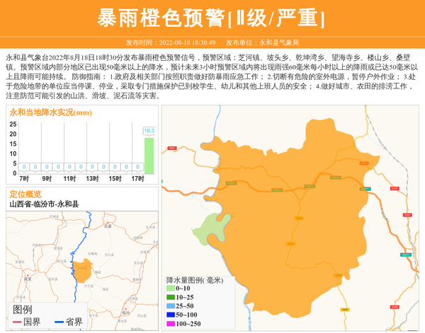 永和县气象台2022年8月18日18时30分发布暴雨橙色预警信号,预警区域:芝河镇、坡头乡、乾坤湾乡、望海寺乡、楼山乡、桑壁镇。预警区域内部分地区已出现50毫米以上的降水,预计未来3小时预警区域内将出现雨强60毫米每小时以上的降雨或已达50毫米以上且降雨可能持续。 防御指南: 1.政府及相关部门按照职责做好防暴雨应急工作; 2.切断有危险的室外电源,暂停户外作业; 3.处于危险地带的单位应当停课、停业,采取专门措施保护已到校学生、幼儿和其他上班人员的安全; 4.做好城市、农田的排涝工作,注意防范可能引发的山洪、滑坡、泥石流等灾害。 信息来源:国家预警信息发布中心; 发布单位:永和县气象局。