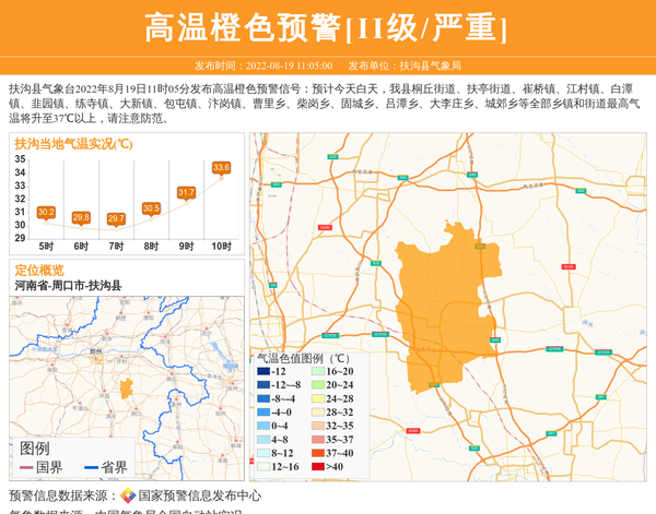 扶沟县气象台2022年8月19日11时05分发布高温橙色预警信号:预计今天白天,我县桐丘街道、扶亭街道、崔桥镇、江村镇、白潭镇、韭园镇、练寺镇、大新镇、包屯镇、汴岗镇、曹里乡、柴岗乡、固城乡、吕潭乡、大李庄乡、城郊乡等全部乡镇和街道最高气温将升至37℃以上,请注意防范。 信息来源:国家预警信息发布中心; 发布单位:扶沟县气象局。