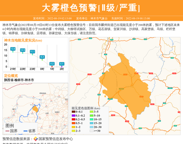 神木市气象台2022年08月19日02时13分发布大雾橙色预警信号:目前我市麟州街道已出现能见度小于200米的雾,预计下述地区未来6小时内将出现能见度小于200米的雾:中鸡镇、大柳塔试验区、万镇、花石崖镇、贺家川镇、沙峁镇、高家堡镇、马镇、栏杆堡镇、锦界镇、尔林兔镇、店塔镇、孙家岔镇、大保当镇,请注意防范。 信息来源:国家预警信息发布中心; 发布单位:神木市气象台。