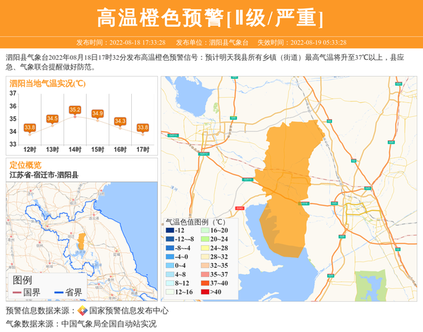 泗阳县气象台2022年08月18日17时32分发布高温橙色预警信号:预计明天我县所有乡镇(街道)最高气温将升至37℃以上,县应急、气象联合提醒做好防范。 信息来源:国家预警信息发布中心; 发布单位:泗阳县气象台。