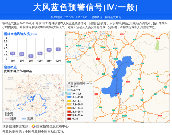 桐梓县气象台2022年08月18日12时55分继续发布大风蓝色预警信号:目前我县黄莲、水坝塘等乡镇已出现6至7级阵风,预计未来24小时内黄莲、水坝塘等乡镇仍将出现7级大风天气,对露天活动及人员安全将造成一定影响,请相关行业和人员注意防范。 信息来源:国家预警信息发布中心; 发布单位:桐梓县气象台。