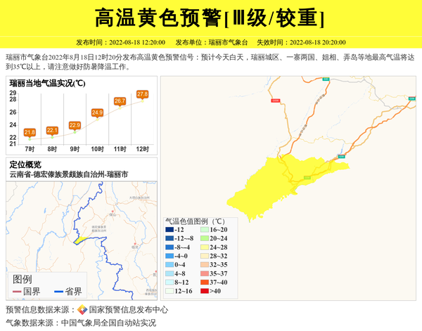 瑞丽市气象台2022年8月18日12时20分发布高温黄色预警信号:预计今天白天,瑞丽城区、一寨两国、姐相、弄岛等地最高气温将达到35℃以上,请注意做好防暑降温工作。 信息来源:国家预警信息发布中心; 发布单位:瑞丽市气象台。