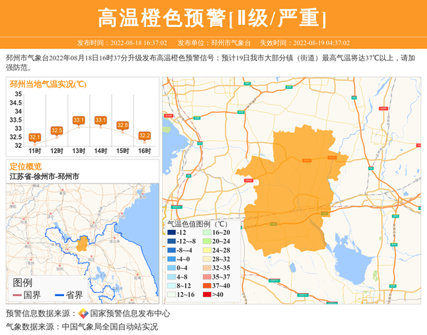 邳州市气象台2022年08月18日16时37分升级发布高温橙色预警信号:预计19日我市大部分镇(街道)最高气温将达37℃以上,请加强防范。 信息来源:国家预警信息发布中心; 发布单位:邳州市气象台。