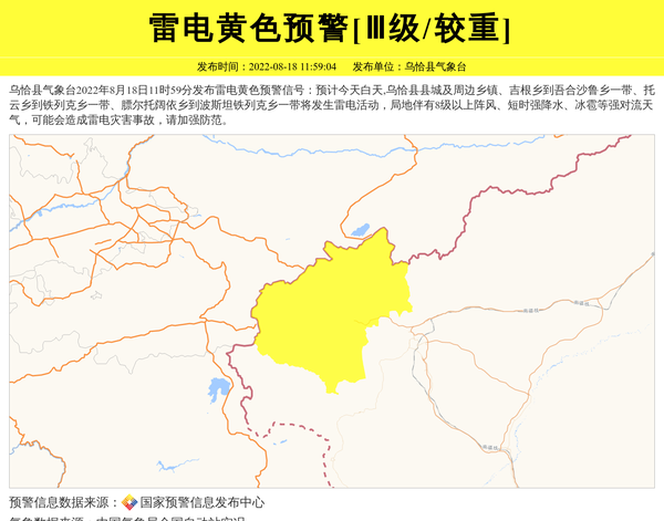 乌恰县气象台2022年8月18日11时59分发布雷电黄色预警信号:预计今天白天,乌恰县县城及周边乡镇、吉根乡到吾合沙鲁乡一带、托云乡到铁列克乡一带、膘尔托阔依乡到波斯坦铁列克乡一带将发生雷电活动,局地伴有8级以上阵风、短时强降水、冰雹等强对流天气,可能会造成雷电灾害事故,请加强防范。 信息来源:国家预警信息发布中心; 发布单位:乌恰县气象台。