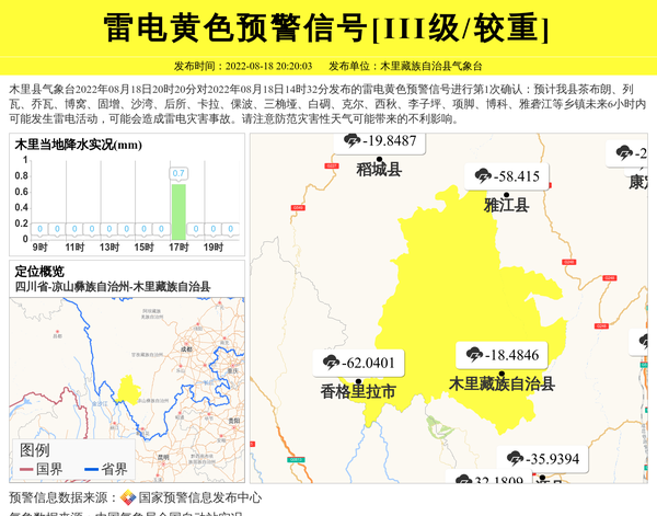 木里县气象台2022年08月18日20时20分对2022年08月18日14时32分发布的雷电黄色预警信号进行第1次确认:预计我县茶布朗、列瓦、乔瓦、博窝、固增、沙湾、后所、卡拉、倮波、三桷垭、白碉、克尔、西秋、李子坪、项脚、博科、雅砻江等乡镇未来6小时内可能发生雷电活动,可能会造成雷电灾害事故。请注意防范灾害性天气可能带来的不利影响。 信息来源:国家预警信息发布中心; 发布单位:木里藏族自治县气象台。