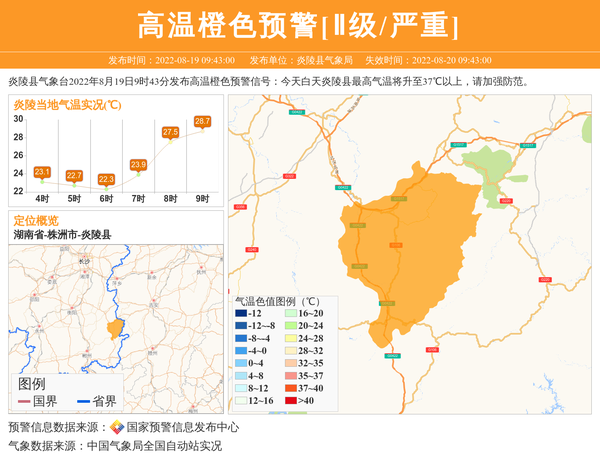 炎陵县气象台2022年8月19日9时43分发布高温橙色预警信号:今天白天炎陵县最高气温将升至37℃以上,请加强防范。 信息来源:国家预警信息发布中心; 发布单位:炎陵县气象局。