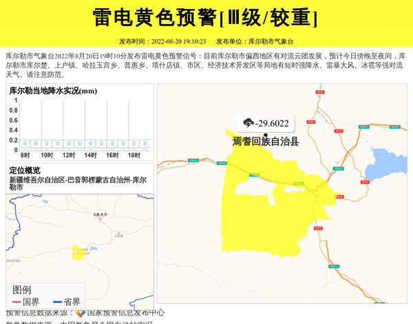 库尔勒市气象台2022年8月20日19时10分发布雷电黄色预警信号:目前库尔勒市偏西地区有对流云团发展,预计今日傍晚至夜间,库尔勒市库尔楚、上户镇、哈拉玉宫乡、普惠乡、塔什店镇、市区、经济技术开发区等局地有短时强降水、雷暴大风、冰雹等强对流天气。请注意防范。 信息来源:国家预警信息发布中心; 发布单位:库尔勒市气象台。