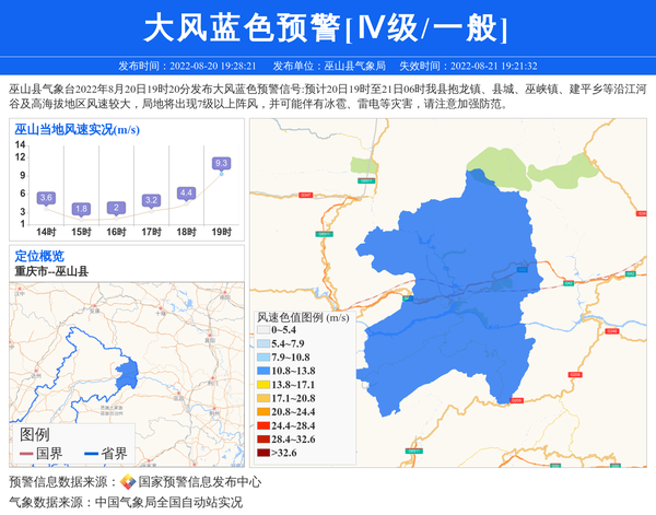 巫山县气象台2022年8月20日19时20分发布大风蓝色预警信号:预计20日19时至21日06时我县抱龙镇、县城、巫峡镇、建平乡等沿江河谷及高海拔地区风速较大,局地将出现7级以上阵风,并可能伴有冰雹、雷电等灾害,请注意加强防范。 信息来源:国家预警信息发布中心; 发布单位:巫山县气象局。