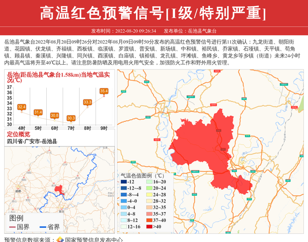 岳池县气象台2022年08月20日09时26分对2022年08月09日09时50分发布的高温红色预警信号进行第11次确认:九龙街道、朝阳街道、花园镇、伏龙镇、齐福镇、西板镇、临溪镇、罗渡镇、普安镇、新场镇、中和镇、裕民镇、乔家镇、石垭镇、天平镇、苟角镇、顾县镇、秦溪镇、兴隆镇、同兴镇、酉溪镇、白庙镇、镇裕镇、龙孔镇、坪滩镇、鱼峰乡、黄龙乡等乡镇(街道)未来24小时内最高气温将升至40℃以上。请注意防暑防晒及用电用火用气安全,加强防火工作和野外用火管理。 信息来源:国家预警信息发布中心; 发布单位:岳池县气象台。