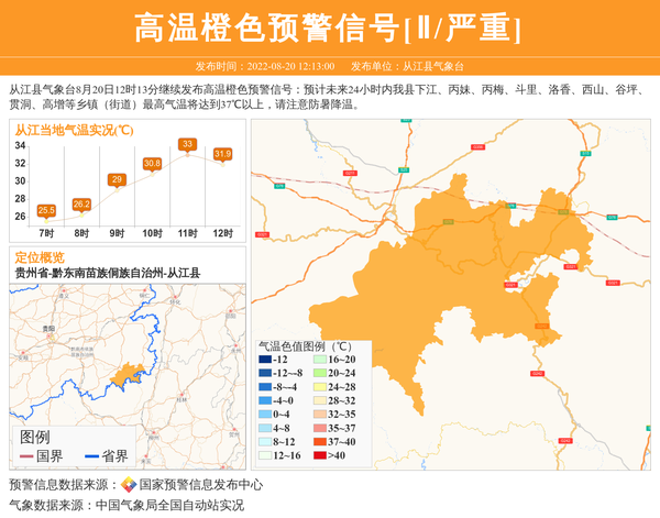 从江县气象台8月20日12时13分继续发布高温橙色预警信号:预计未来24小时内我县下江、丙妹、丙梅、斗里、洛香、西山、谷坪、贯洞、高增等乡镇(街道)最高气温将达到37℃以上,请注意防暑降温。 信息来源:国家预警信息发布中心; 发布单位:从江县气象台。