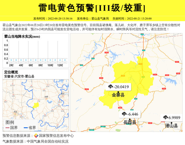 霍山县气象台2022年08月20日13时20分发布雷电黄色预警信号。目前我县诸佛庵、落儿岭、大化坪、磨子潭等乡镇上空有分散性对流云团生成并发展,预计6小时内我县可能发生雷电活动,并可能伴有短时强降水、瞬时阵风等对流性天气,请注意防范! 信息来源:国家预警信息发布中心; 发布单位:霍山县气象局。