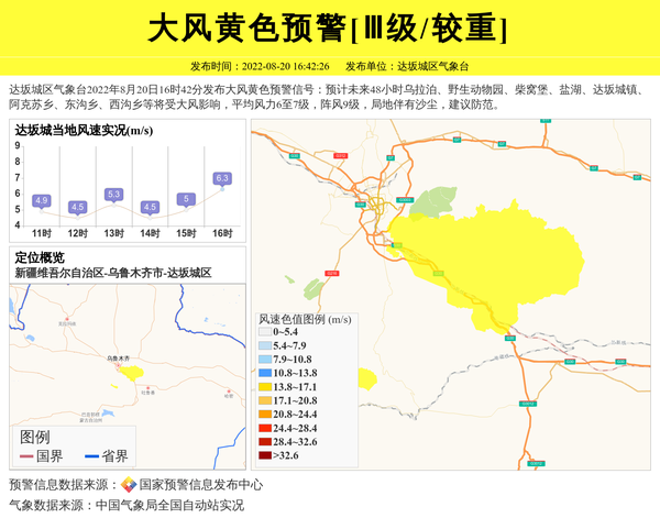 达坂城区气象台2022年8月20日16时42分发布大风黄色预警信号:预计未来48小时乌拉泊、野生动物园、柴窝堡、盐湖、达坂城镇、阿克苏乡、东沟乡、西沟乡等将受大风影响,平均风力6至7级,阵风9级,局地伴有沙尘,建议防范。 信息来源:国家预警信息发布中心; 发布单位:达坂城区气象台。