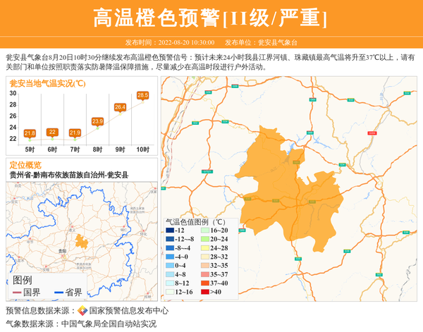 瓮安县气象台8月20日10时30分继续发布高温橙色预警信号:预计未来24小时我县江界河镇、珠藏镇最高气温将升至37℃以上,请有关部门和单位按照职责落实防暑降温保障措施,尽量减少在高温时段进行户外活动。 信息来源:国家预警信息发布中心; 发布单位:瓮安县气象台。