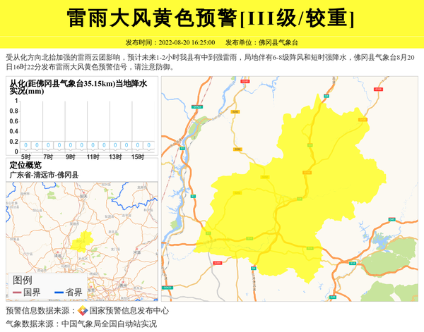 受从化方向北抬加强的雷雨云团影响,预计未来1-2小时我县有中到强雷雨,局地伴有6-8级阵风和短时强降水,佛冈县气象台8月20日16时22分发布雷雨大风黄色预警信号,请注意防御。 信息来源:国家预警信息发布中心; 发布单位:佛冈县气象台。