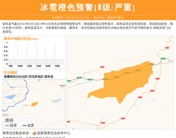 新和县气象台2022年8月20日19时34分发布冰雹橙色预警信号:根据最新雷达资料显示,新和县西北部有强回波,受其移动影响,预计未来6小时内,新和县英买力、尤鲁都斯巴格镇、桑塔木、塔木托格拉克镇等部分乡镇出现冰雹天气的可能性较大,请相关部门注意防范。 信息来源:国家预警信息发布中心; 发布单位:新和县气象台。