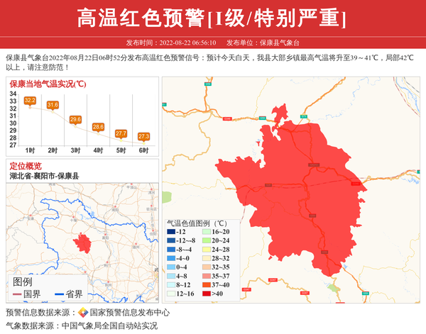 保康县气象台2022年08月22日06时52分发布高温红色预警信号:预计今天白天,我县大部乡镇最高气温将升至39~41℃,局部42℃以上,请注意防范! 信息来源:国家预警信息发布中心; 发布单位:保康县气象台。