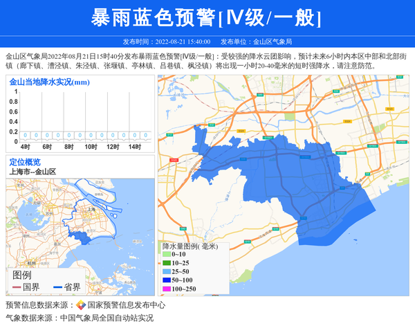 金山区气象局2022年08月21日15时40分发布暴雨蓝色预警[Ⅳ级/一般]:受较强的降水云团影响,预计未来6小时内本区中部和北部街镇(廊下镇、漕泾镇、朱泾镇、张堰镇、亭林镇、吕巷镇、枫泾镇)将出现一小时20-40毫米的短时强降水,请注意防范。 信息来源:国家预警信息发布中心; 发布单位:金山区气象局。