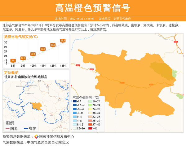 迭部县气象台2022年08月21日13时36分发布高温橙色预警信号:预计24小时内,我县旺藏镇、桑坝乡、洛大镇、卡坝乡、达拉乡、尼傲乡、阿夏乡、多儿乡等部分地区最高气温将升至37℃以上,请注意防范。 信息来源:国家预警信息发布中心; 发布单位:迭部县气象台。