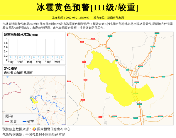 吉林省洮南市气象局2022年8月21日23时00分发布冰雹黄色预警信号:预计未来6小时,我市部分地方将出现冰雹天气,局部地方伴有雷暴大风和短时强降水,市应急管理局、市气象局联合提醒:注意做好防范工作。 信息来源:国家预警信息发布中心; 发布单位:洮南市气象局。
