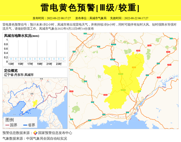 雷电黄色预警信号:预计未来1到2小时,凤城市将出现雷电天气,并将持续3到4小时,同时可能伴有短时大风、短时强降水等强对流天气,请做好防雷工作。凤城市气象台2022年8月22日0时14分发布 信息来源:国家预警信息发布中心; 发布单位:凤城市气象局。