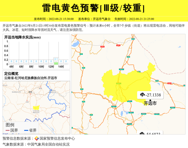 开远市气象台2022年8月21日15时30分发布雷电黄色预警信号:预计未来6小时,全市7个乡镇(街道)将出现雷电活动,局地可能伴大风、冰雹、短时强降水等强对流天气,请注意加强防范。 信息来源:国家预警信息发布中心; 发布单位:开远市气象台。
