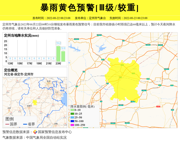 定州市气象台2022年08月22日00时18分继续发布暴雨黄色预警信号:目前我市砖路镇小时雨强已达60毫米以上,预计今天夜间降水仍将持续,请有关单位和人员做好防范准备。 信息来源:国家预警信息发布中心; 发布单位:定州市气象台。