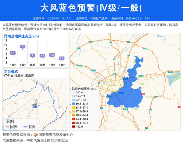 大风蓝色预警信号:预计21日20时到22日8时,沈阳市浑南区偏南风4到6级,阵风7级,请注意出行安全,加固临时搭建物,防范高空坠物等风险。浑南区气象台2022年8月21日18时16分发布 信息来源:国家预警信息发布中心; 发布单位:浑南区气象局。