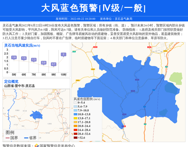 灵石县气象局2022年8月22日10时20分发布大风蓝色预警,预警区域:所有乡镇(街、道)。预计未来24小时,预警区域内部分乡镇可能受大风影响,平均风力4-5级,阵风可达6-7级。请有关单位和人员做好防范准备。 防御指南: 1.政府及相关部门按照职责做好防大风工作; 2.关好门窗,加固围板、棚架、广告牌等易被风吹动的搭建物,妥善安置易受大风影响的室外物品,遮盖建筑物资; 3.行人注意尽量少骑自行车,刮风时不要在广告牌、临时搭建物等下面逗留; 4.有关部门和单位注意森林、草原等防火。 信息来源:国家预警信息发布中心; 发布单位:灵石县气象局。