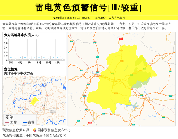 大方县气象台2022年8月23日13时52分发布雷电黄色预警信号:预计未来3小时我县凤山、六龙、东关、安乐等乡镇将发生雷电活动,局地可能伴有冰雹、大风、短时强降水等强对流天气,请停止在空旷的地方开展户外活动,相关部门做好雷电应对工作。 信息来源:国家预警信息发布中心; 发布单位:大方县气象台。