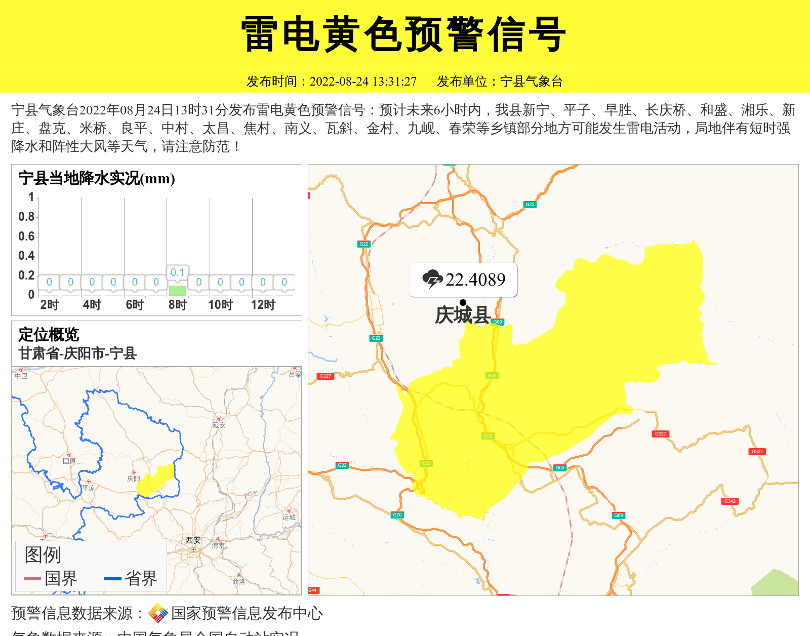 宁县气象台2022年08月24日13时31分发布雷电黄色预警信号:预计未来6小时内,我县新宁、平子、早胜、长庆桥、和盛、湘乐、新庄、盘克、米桥、良平、中村、太昌、焦村、南义、瓦斜、金村、九岘、春荣等乡镇部分地方可能发生雷电活动,局地伴有短时强降水和阵性大风等天气,请注意防范! 信息来源:国家预警信息发布中心; 发布单位:宁县气象台。