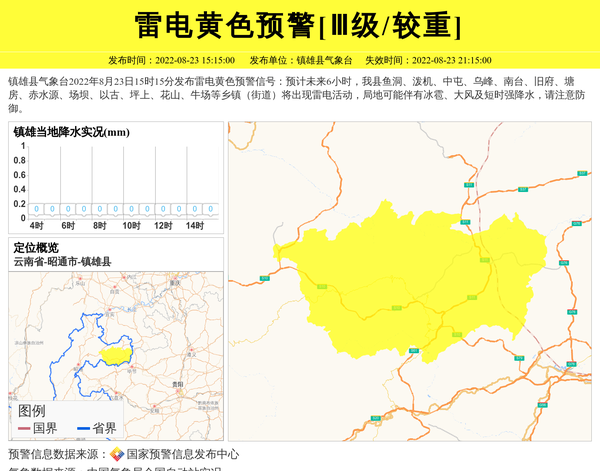 镇雄县气象台2022年8月23日15时15分发布雷电黄色预警信号:预计未来6小时,我县鱼洞、泼机、中屯、乌峰、南台、旧府、塘房、赤水源、场坝、以古、坪上、花山、牛场等乡镇(街道)将出现雷电活动,局地可能伴有冰雹、大风及短时强降水,请注意防御。 信息来源:国家预警信息发布中心; 发布单位:镇雄县气象台。