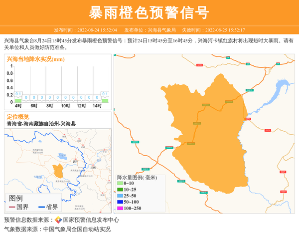 兴海县气象台8月24日15时45分发布暴雨橙色预警信号:预计24日15时45分至16时45分,兴海河卡镇红旗村将出现短时大暴雨。请有关单位和人员做好防范准备。 信息来源:国家预警信息发布中心; 发布单位:兴海县气象局。