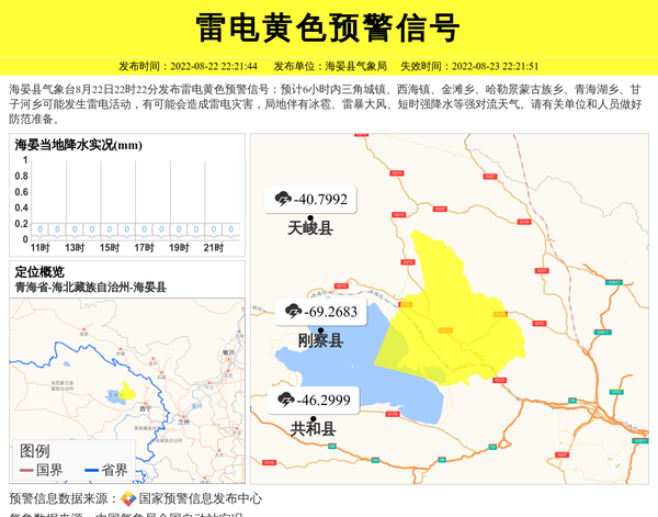 海晏县气象台8月22日22时22分发布雷电黄色预警信号:预计6小时内三角城镇、西海镇、金滩乡、哈勒景蒙古族乡、青海湖乡、甘子河乡可能发生雷电活动,有可能会造成雷电灾害,局地伴有冰雹、雷暴大风、短时强降水等强对流天气。请有关单位和人员做好防范准备。 信息来源:国家预警信息发布中心; 发布单位:海晏县气象局。