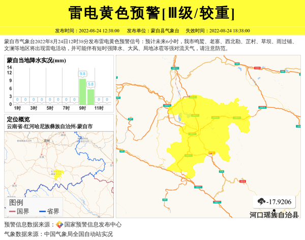 蒙自市气象台2022年8月24日12时38分发布雷电黄色预警信号:预计未来6小时,我市鸣鹫、老寨、西北勒、芷村、草坝、雨过铺、文澜等地区将出现雷电活动,并可能伴有短时强降水、大风、局地冰雹等强对流天气,请注意防范。 信息来源:国家预警信息发布中心; 发布单位:蒙自县气象台。