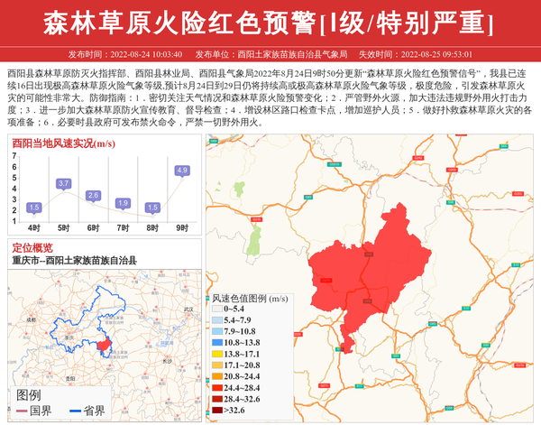 酉阳县森林草原防灭火指挥部、酉阳县林业局、酉阳县气象局2022年8月24日9时50分更新“森林草原火险红色预警信号”,我县已连续16日出现极高森林草原火险气象等级,预计8月24日到29日仍将持续高或极高森林草原火险气象等级,极度危险,引发森林草原火灾的可能性非常大。防御指南:1.密切关注天气情况和森林草原火险预警变化;2.严管野外火源,加大违法违规野外用火打击力度;3.进一步加大森林草原防火宣传教育、督导检查;4.增设林区路口检查卡点,增加巡护人员;5.做好扑救森林草原火灾的各项准备;6.必要时县政府可发布禁火命令,严禁一切野外用火。 信息来源:国家预警信息发布中心; 发布单位:酉阳土家族苗族自治县气象局。