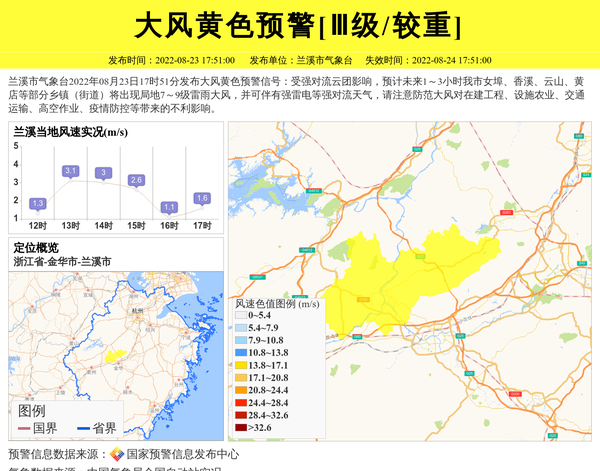 兰溪市气象台2022年08月23日17时51分发布大风黄色预警信号:受强对流云团影响,预计未来1~3小时我市女埠、香溪、云山、黄店等部分乡镇(街道)将出现局地7~9级雷雨大风,并可伴有强雷电等强对流天气,请注意防范大风对在建工程、设施农业、交通运输、高空作业、疫情防控等带来的不利影响。 信息来源:国家预警信息发布中心; 发布单位:兰溪市气象台。