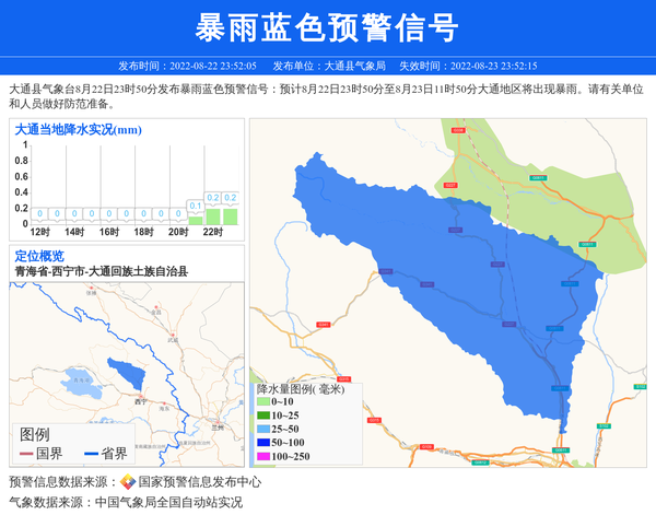 大通县气象台8月22日23时50分发布暴雨蓝色预警信号:预计8月22日23时50分至8月23日11时50分大通地区将出现暴雨。请有关单位和人员做好防范准备。 信息来源:国家预警信息发布中心; 发布单位:大通县气象局。