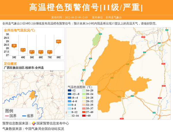 全州县气象台23日9时12分继续发布高温橙色预警信号:预计未来24小时内我县将出现37度以上的高温天气,请做好防范。 信息来源:国家预警信息发布中心; 发布单位:全州县气象台。