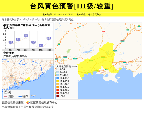 海丰县气象台于2022年8月24日11时41分将台风预警信号升级为黄色。 信息来源:国家预警信息发布中心; 发布单位:海丰县气象台。