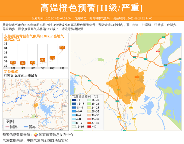 共青城市气象台2022年08月23日09时34分继续发布高温橙色预警信号:预计未来24小时内,茶山街道、甘露镇、江益镇、金湖乡、苏家垱乡、泽泉乡最高气温将达37°C以上,请注意防暑降温。 信息来源:国家预警信息发布中心; 发布单位:共青城市气象局。