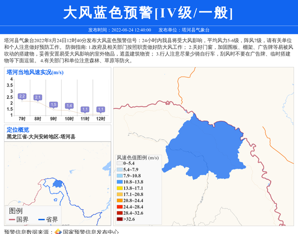 塔河县气象台2022年8月24日12时40分发布大风蓝色预警信号:24小时内我县将受大风影响,平均风力5-6级,阵风7级,请有关单位和个人注意做好预防工作。 防御指南:1.政府及相关部门按照职责做好防大风工作;2.关好门窗,加固围板、棚架、广告牌等易被风吹动的搭建物,妥善安置易受大风影响的室外物品,遮盖建筑物资; 3.行人注意尽量少骑自行车,刮风时不要在广告牌、临时搭建物等下面逗留。4.有关部门和单位注意森林、草原等防火。 信息来源:国家预警信息发布中心; 发布单位:塔河县气象台。