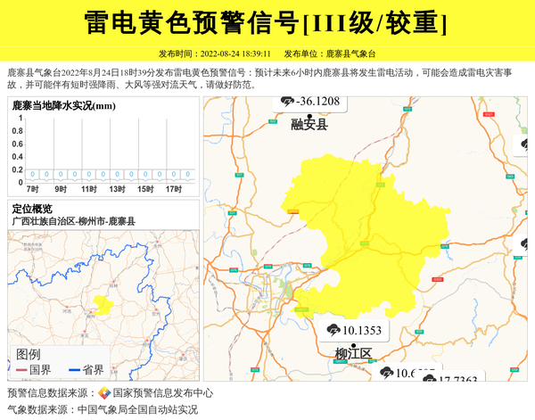 鹿寨县气象台2022年8月24日18时39分发布雷电黄色预警信号:预计未来6小时内鹿寨县将发生雷电活动,可能会造成雷电灾害事故,并可能伴有短时强降雨、大风等强对流天气,请做好防范。 信息来源:国家预警信息发布中心; 发布单位:鹿寨县气象台。