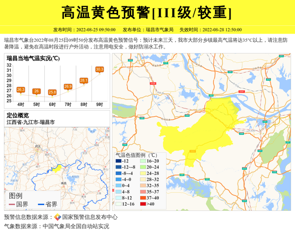 瑞昌市气象台2022年08月25日09时50分发布高温黄色预警信号:预计未来三天,我市大部分乡镇最高气温将达35°C以上,请注意防暑降温,避免在高温时段进行户外活动,注意用电安全,做好防溺水工作。 信息来源:国家预警信息发布中心; 发布单位:瑞昌市气象局。