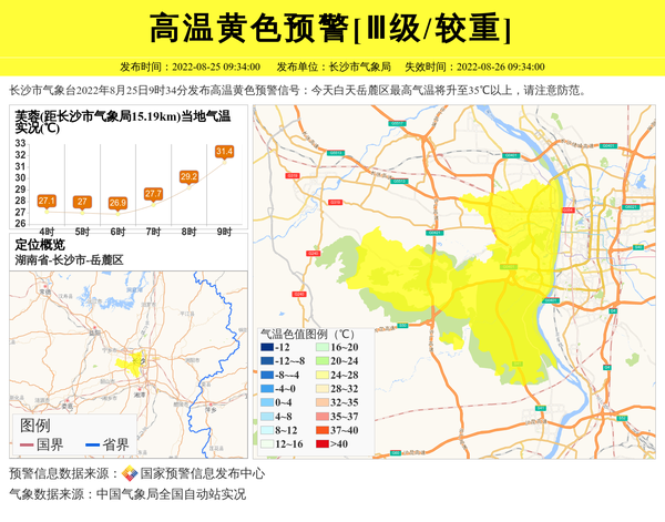 长沙市气象台2022年8月25日9时34分发布高温黄色预警信号:今天白天岳麓区最高气温将升至35℃以上,请注意防范。 信息来源:国家预警信息发布中心; 发布单位:长沙市气象局。