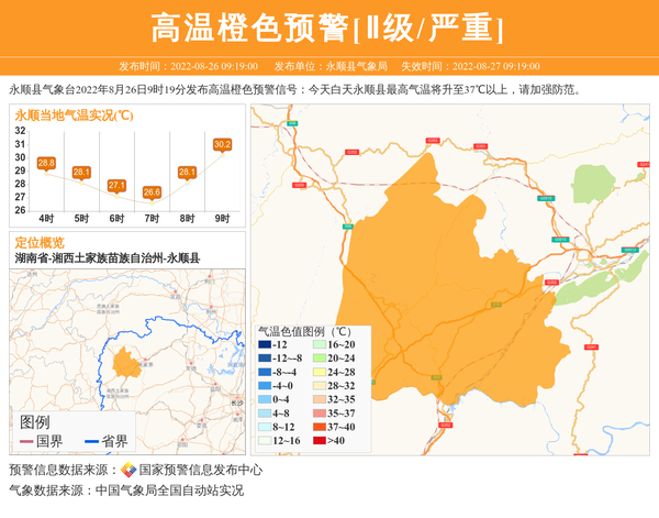 永顺县气象台2022年8月26日9时19分发布高温橙色预警信号:今天白天永顺县最高气温将升至37℃以上,请加强防范。 信息来源:国家预警信息发布中心; 发布单位:永顺县气象局。