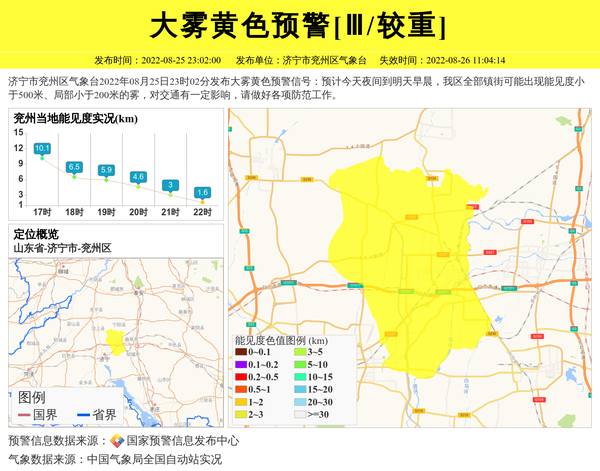 济宁市兖州区气象台2022年08月25日23时02分发布大雾黄色预警信号:预计今天夜间到明天早晨,我区全部镇街可能出现能见度小于500米、局部小于200米的雾,对交通有一定影响,请做好各项防范工作。 信息来源:国家预警信息发布中心; 发布单位:济宁市兖州区气象台。