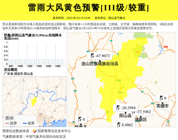 受从英德和清新方向移入我县的强对流云团影响,预计未来1-3小时我县杜步镇、七拱镇、太平镇、杨梅镇将有强雷电、8级左右的短时大风和小时雨强20-30毫米的短时强降水,阳山县气象台8月24日19时19分发布上述地区雷雨大风黄色预警信号。 信息来源:国家预警信息发布中心; 发布单位:阳山县气象台。