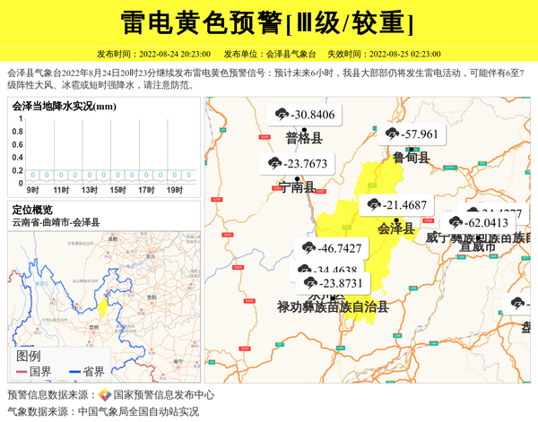 会泽县气象台2022年8月24日20时23分继续发布雷电黄色预警信号:预计未来6小时,我县大部部仍将发生雷电活动,可能伴有6至7级阵性大风、冰雹或短时强降水,请注意防范。 信息来源:国家预警信息发布中心; 发布单位:会泽县气象台。